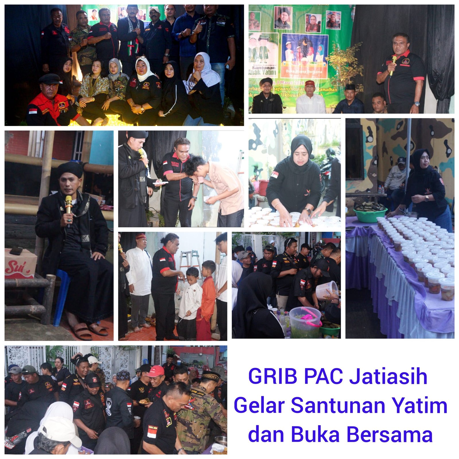 Sudutmatanews com – Kota Bekasi, Gerakan Rakyat Indonesia Bersatu (GRIB) Jaya PAC Jatiasih yang dipimpin Ketua Andreas Beda kredok menggelar acara santunan anak yatim dan buka bersama di kantor sekretariat berlokasi di Jalan Pondok Gede Permai, Jatirasa, Kecamatan Jatiasih, Kota Bekasi. ( 08 Maret 2027 )